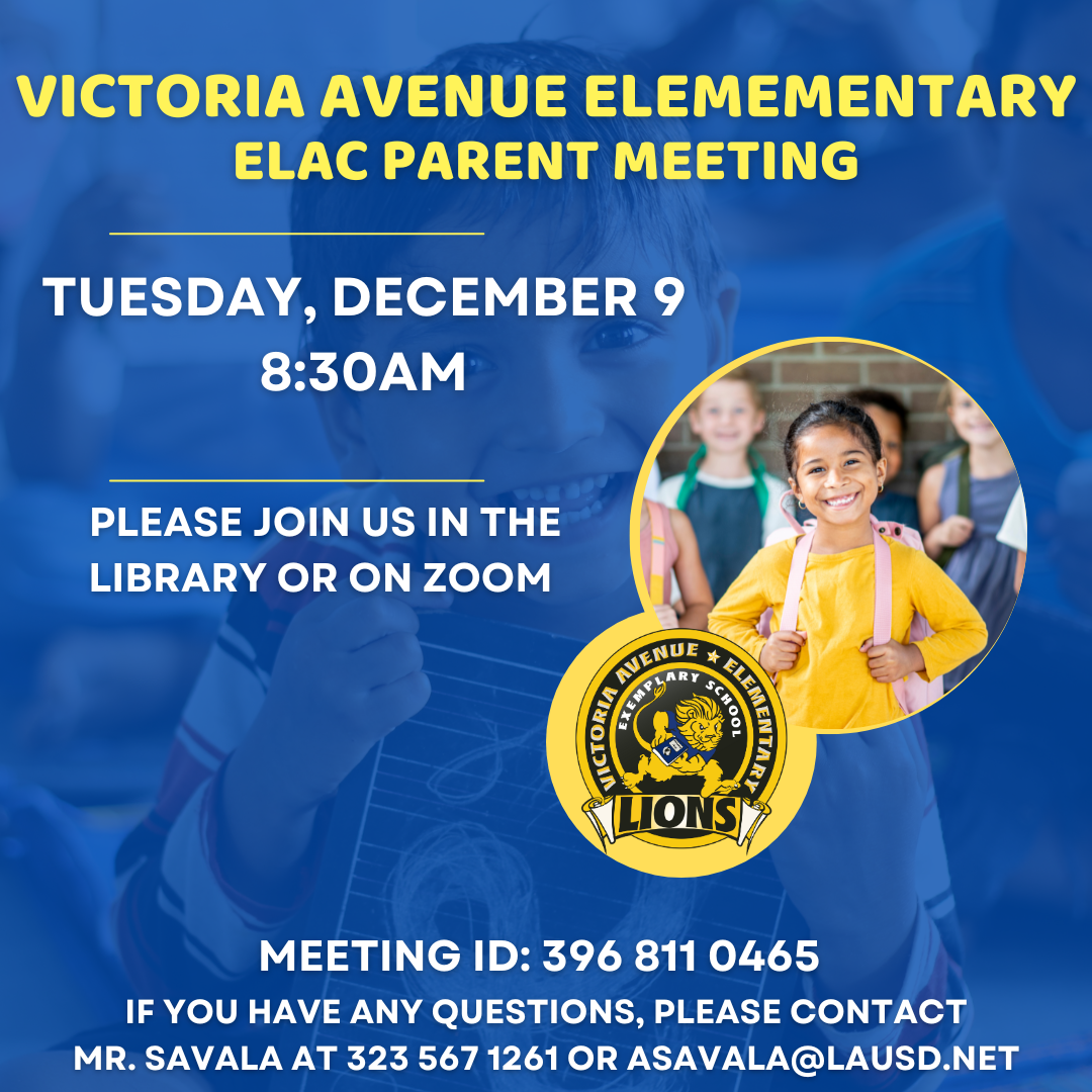 Please join us on Tuesday, December 9 at 8:30am for our ELAC parent meeting either in our library or on Zoom. If you have any questions please contact Mr. Savala at 323 567 1261 or [email protected].